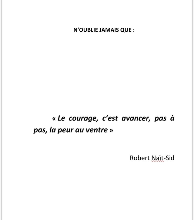 Comme a dit Robert Naït-Sid: "Le courage, c'est avancer pas à pas, la peur au ventre."
